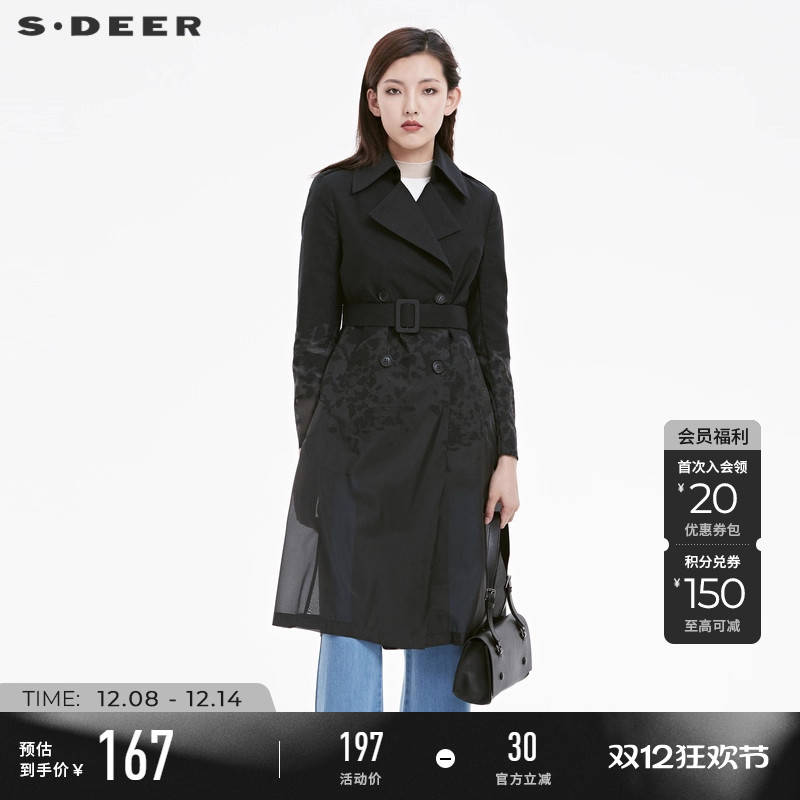 sdeer圣迪奥春秋装女装翻领印花收腰双排扣长款风衣S22181814