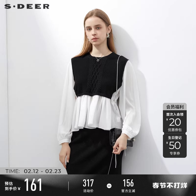 sdeer圣迪奥春秋装女装圆领钩花收腰雪纺拼接针织衫S231Z3509