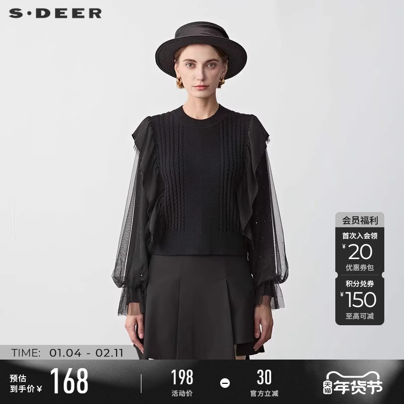 sdeer圣迪奥春秋装女装罗纹圆领钩花网纱拼接针织衫S223Z3558