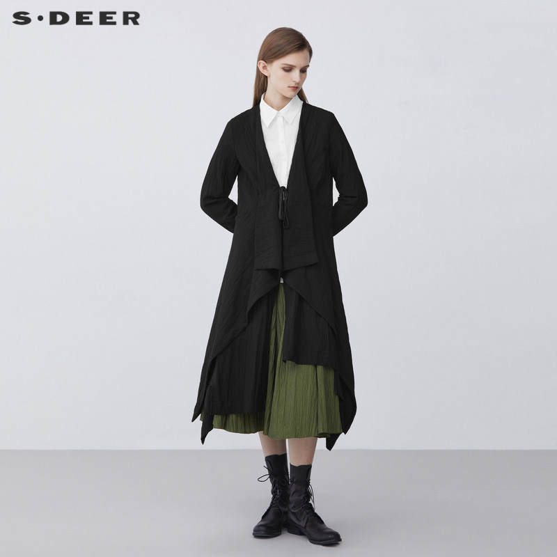 sdeer圣迪奥春秋装女装休闲V领肌理褶皱不规则长袖风衣S21381809