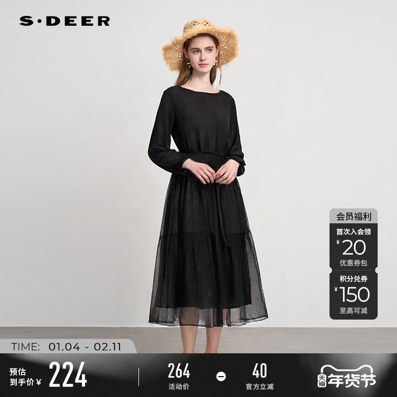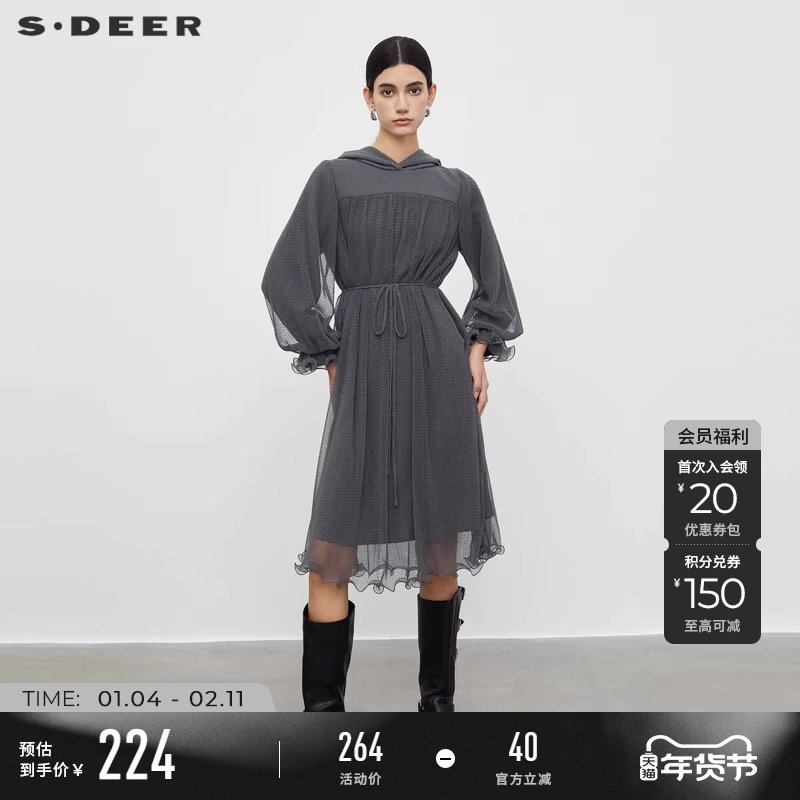sdeer圣迪奥春秋装女装休闲连帽收腰网纱卫衣连衣裙S233D1201