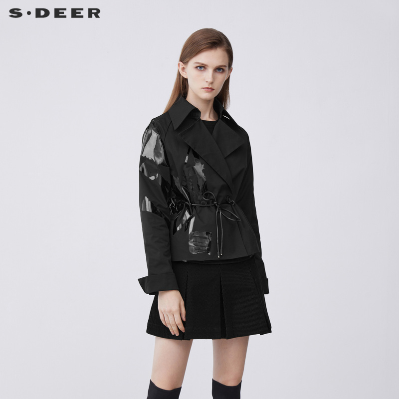 sdeer圣迪奥春秋装女装翻领撞色胶印收腰短款风衣外套S21382220