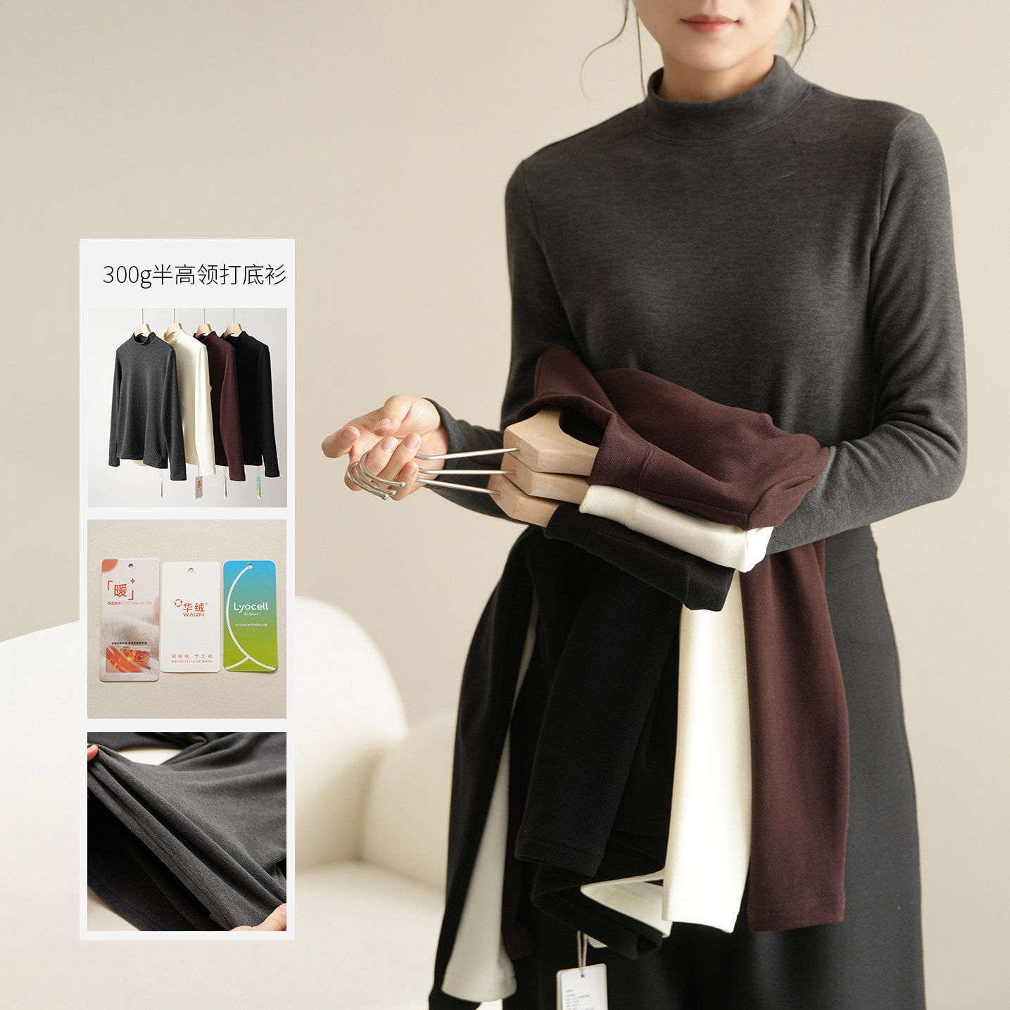 莫代尔半高领打底衫女秋冬薄绒磨毛内搭中领长袖保暖套装秋衣上衣