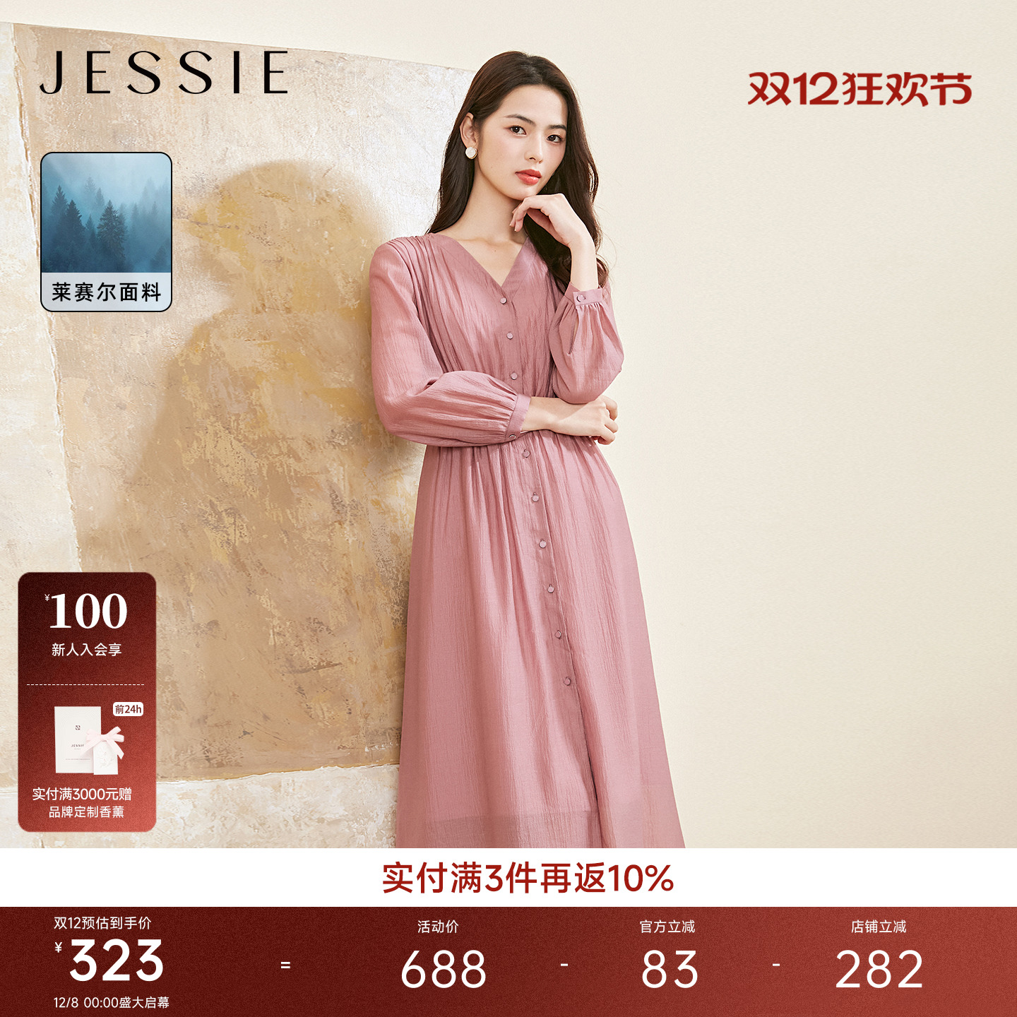 JESSIE法式V领连衣裙秋装女款新款长款收腰高级莱赛尔长袖连衣裙