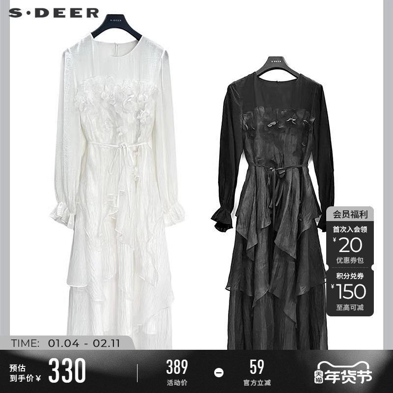 sdeer圣迪奥春秋装女装圆领收腰晕染网纱泡泡袖连衣裙S233Z12D7