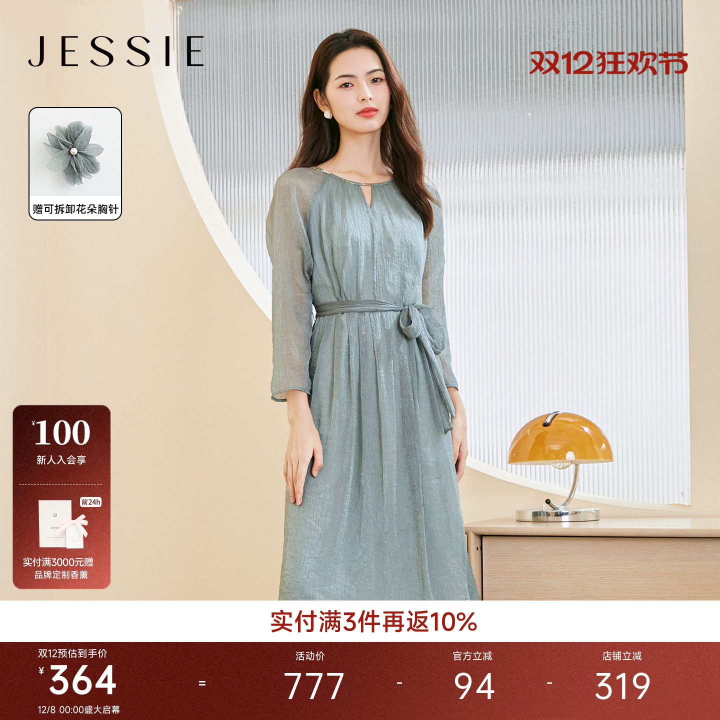 JESSIE气质V领连衣裙秋装女款新款收腰A字裙女法式风慵懒文艺清新