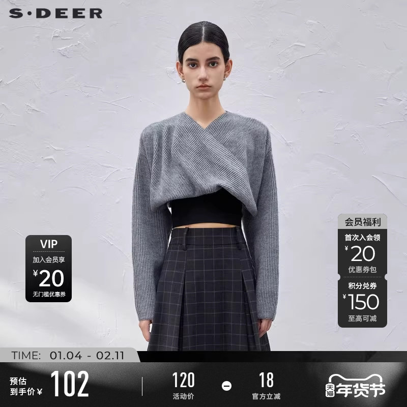 sdeer圣迪奥春秋装女装设计感V领交叉不规则针织衫S23383504