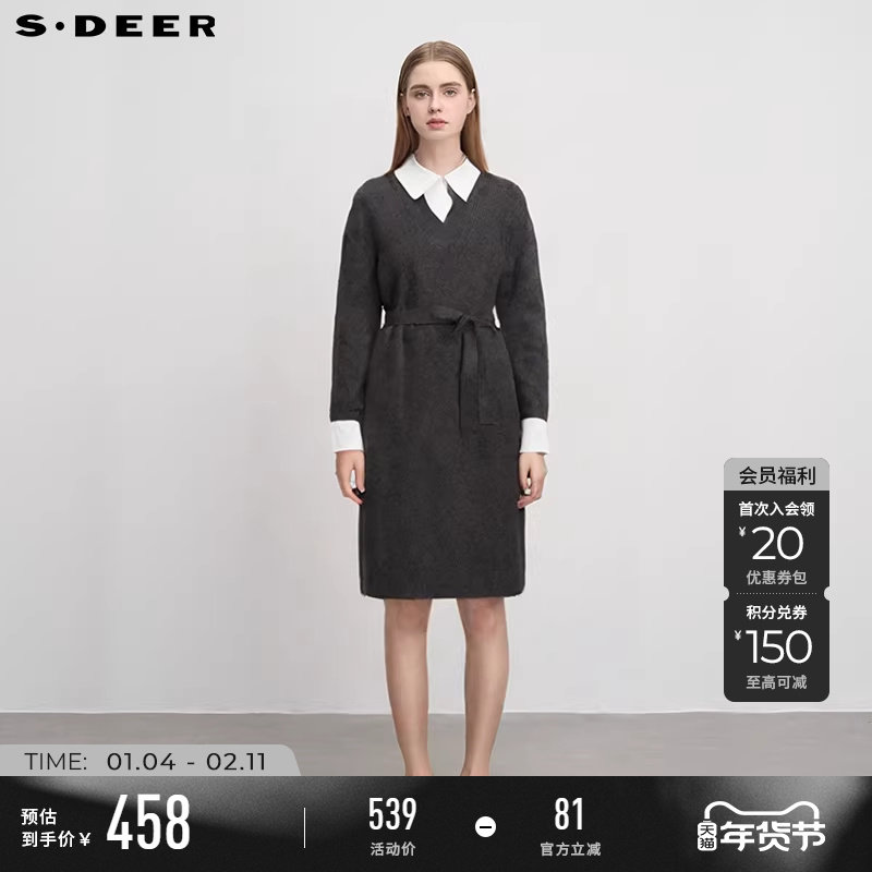sdeer圣迪奥春秋装女装罗纹圆领喇叭袖针织连衣裙S233Z1289