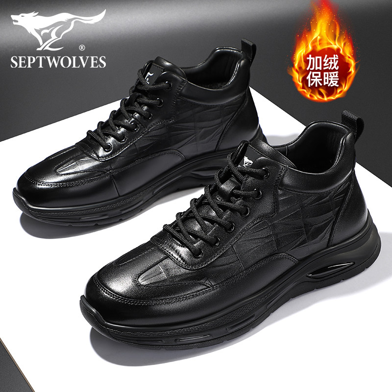七匹狼男鞋厚底板鞋男冬季真皮休闲鞋加绒保暖男士工装鞋黑色皮鞋