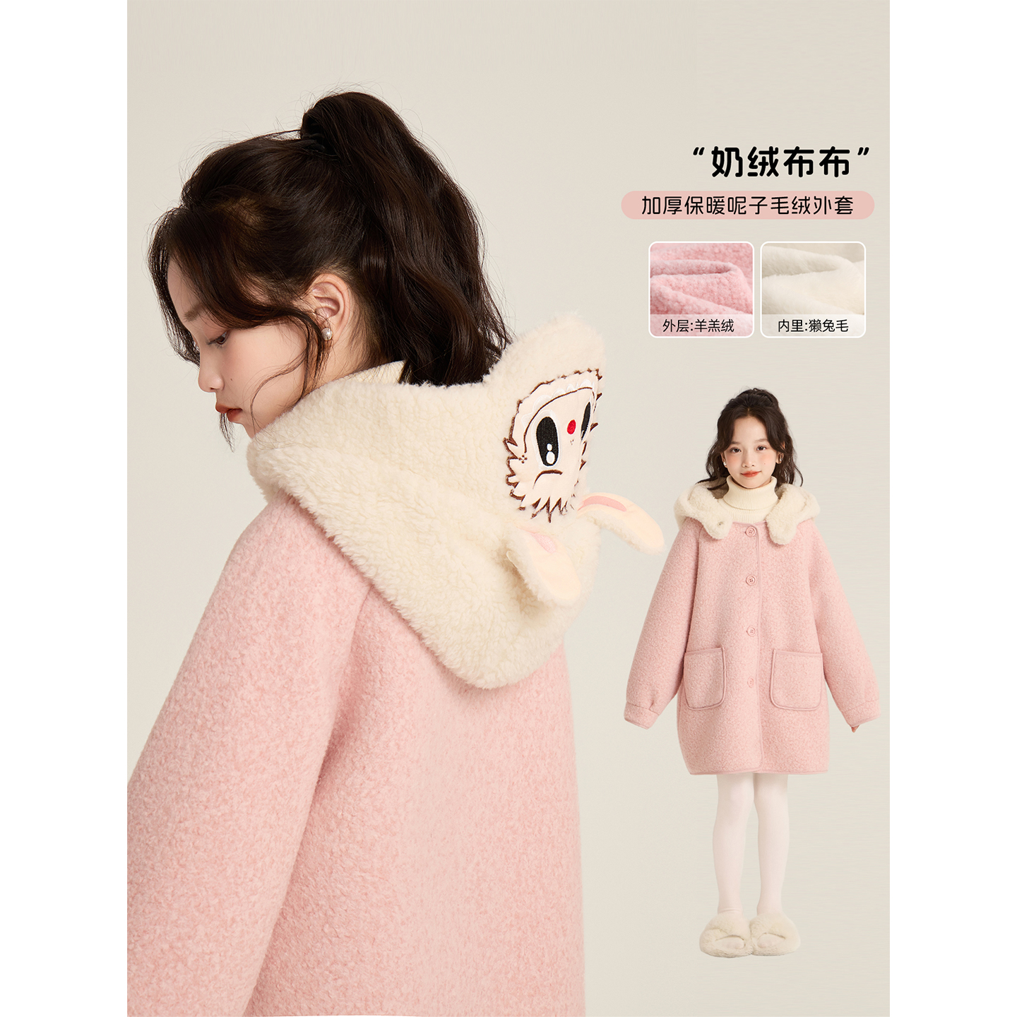拉夏贝尔女童加绒毛呢外套2025新款冬季加厚保暖呢子大衣女孩冬装