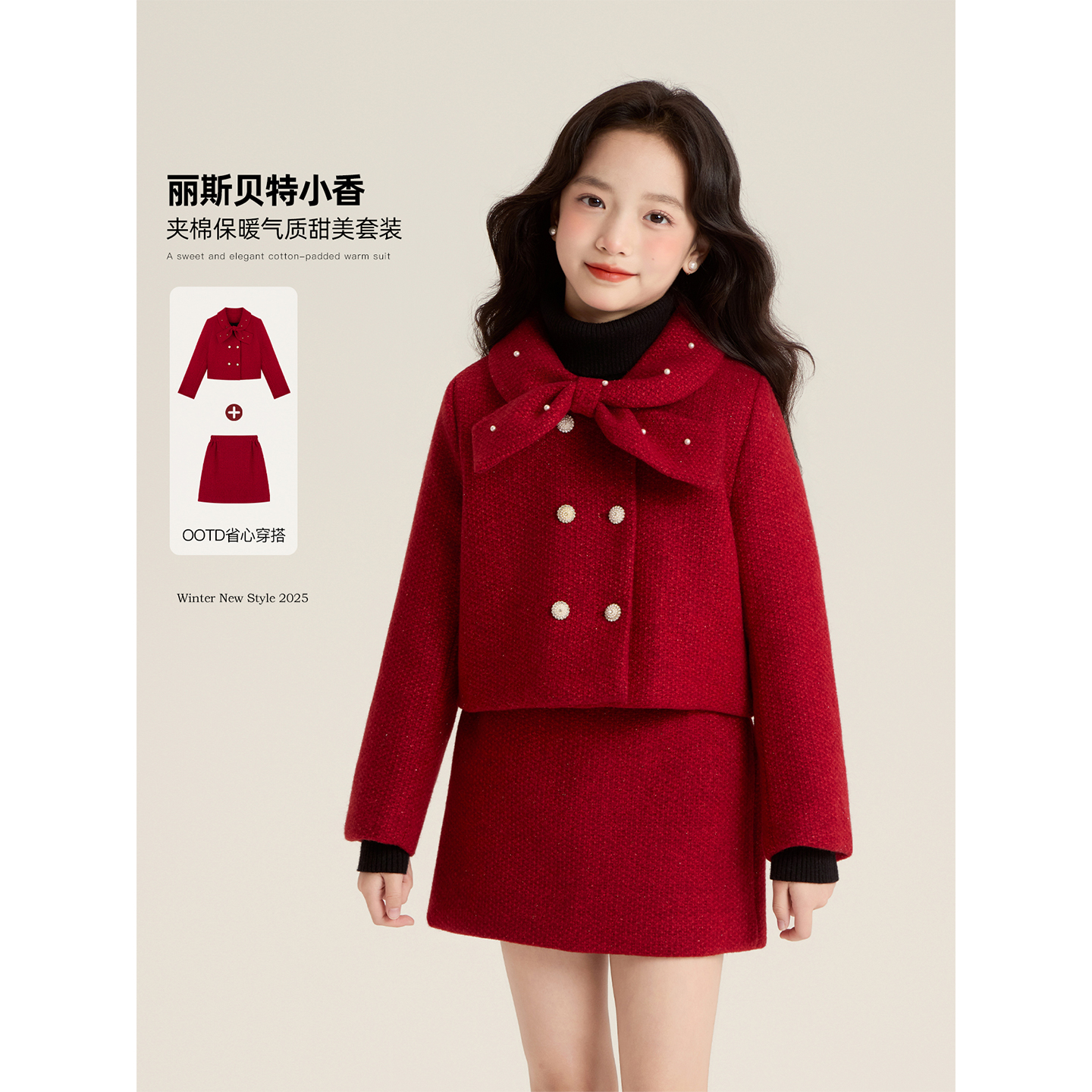Amybaby女童套装冬季2025新款夹棉红色呢子小香风外套连衣裙马甲