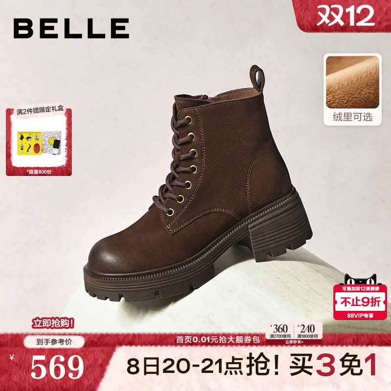 百丽厚底复古英伦风马丁靴女冬季新款工装靴加绒短靴子B9H1DDD4