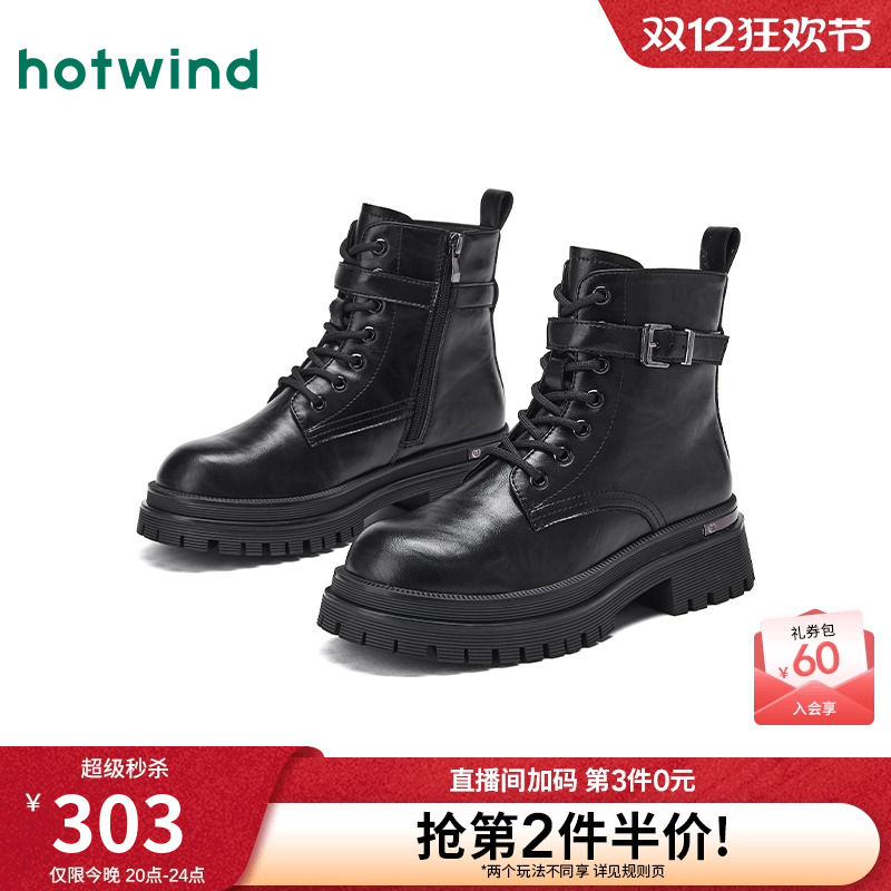 热风加绒厚底马丁靴女款2024年冬季新款黑色双系带保暖短筒休闲靴