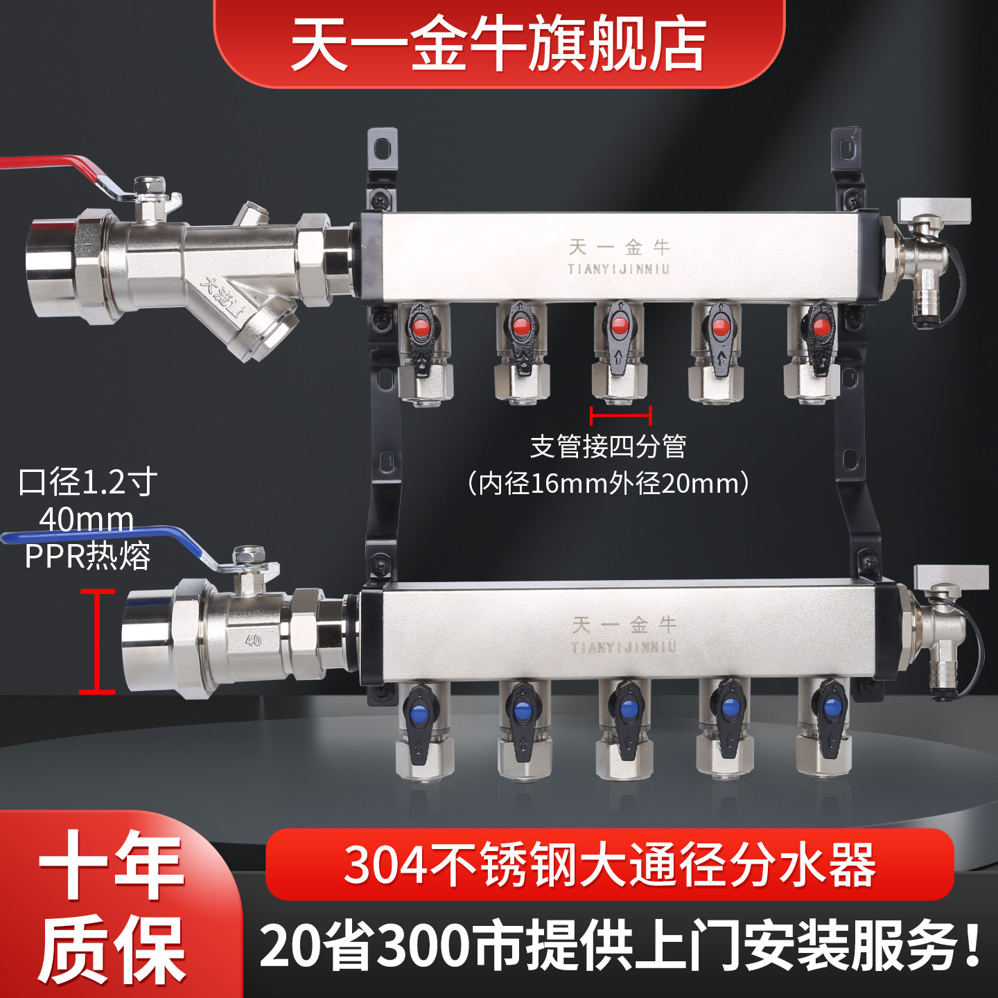 天一金牛地暖分水器304不锈钢家用暖气分水器 1.2寸主杠超大流量