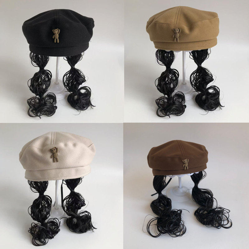 儿童帽子春秋女童假发公主贝雷画家帽小女孩冬天毛呢八角蓓蕾长发