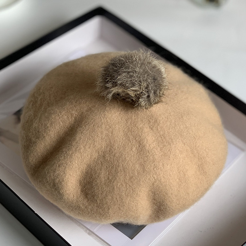 新款可爱兔毛球羊毛贝雷帽女秋冬韩版纯色百搭画家帽子冬天蓓蕾帽