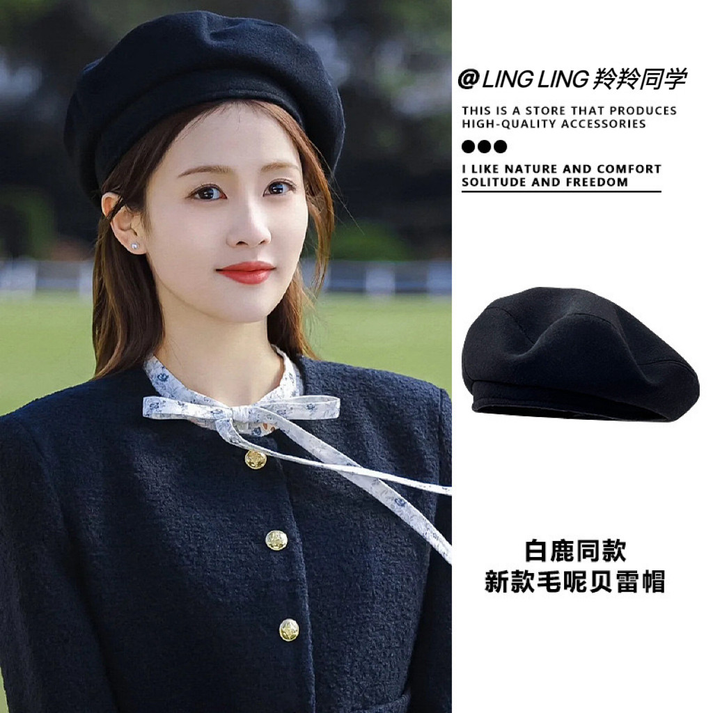 白鹿郑书意同款黑色贝雷帽女秋冬天复古百搭毛呢平顶蓓蕾画家帽子