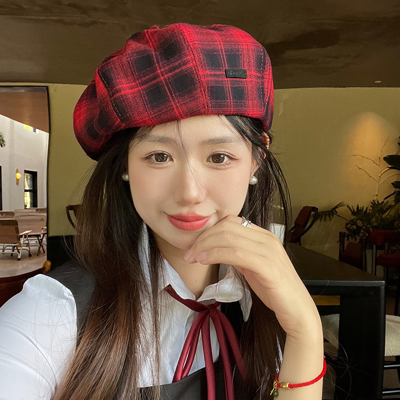 复古格子贝雷帽子女秋冬天休闲画家帽英伦百搭蓓蕾帽显脸小南瓜帽