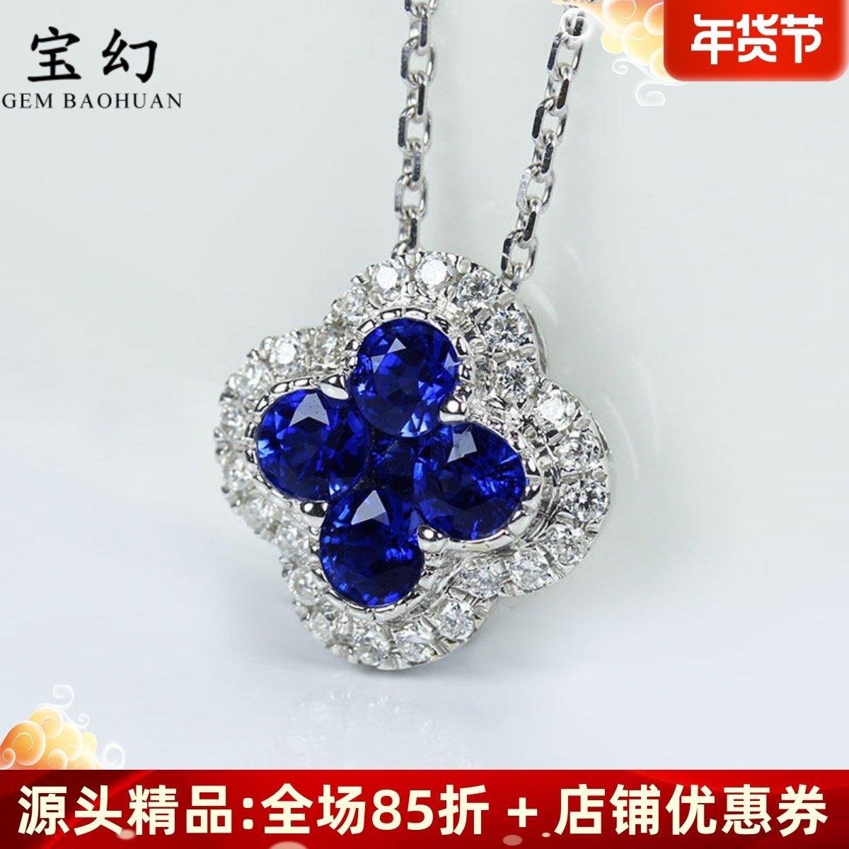 小号18K白金天然皇家蓝宝石四叶草吊坠 镶钻石锁骨项链女款配套