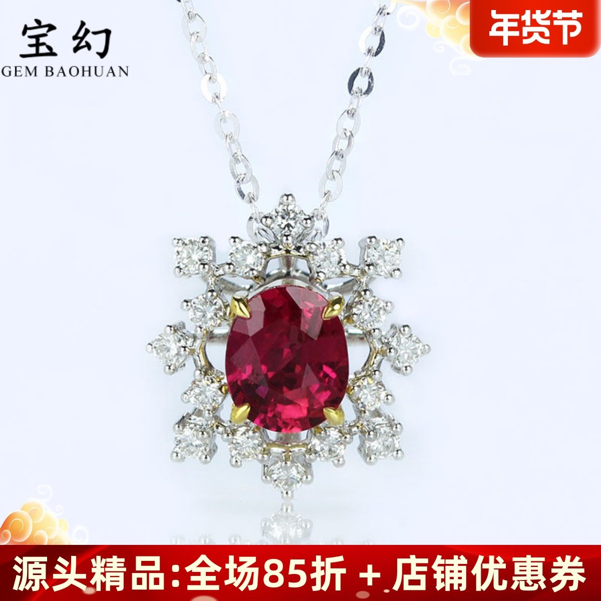 G18K白金天然红宝石雪花锁骨项链 明艳玫红色钻石吊坠女款正品