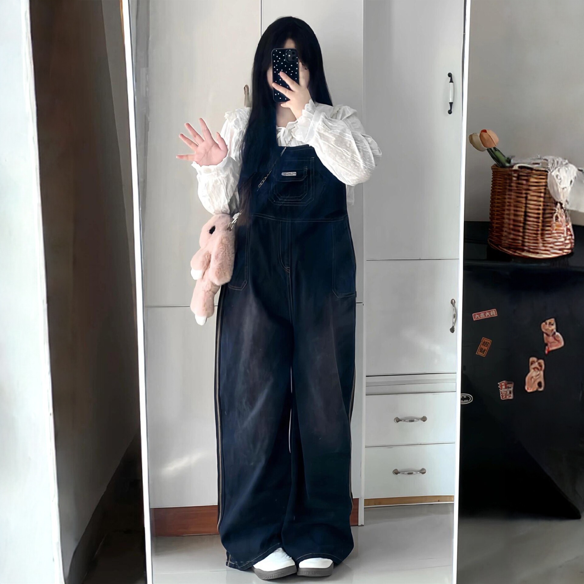 300斤胖mm大码女装美式复古宽松牛仔背带裤女宽松显瘦工装阔腿裤