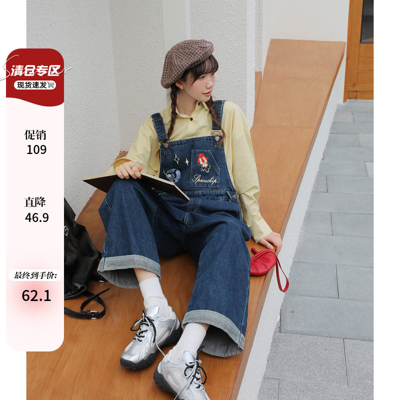 小菲家~牛仔背带裤女春夏新款2024胖mm文艺减龄撞色贴布连体长裤
