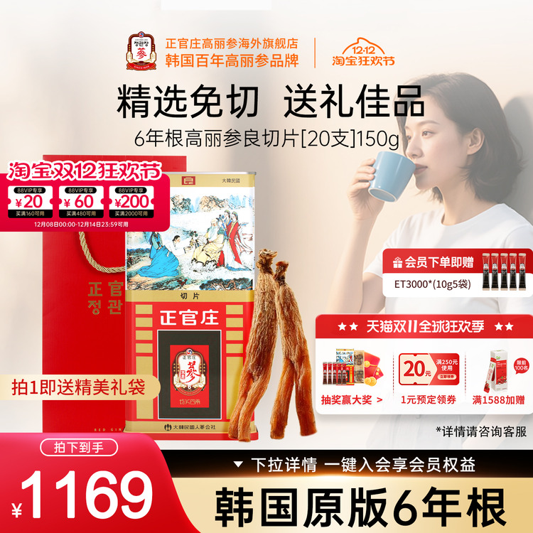 韩国正官庄6年根高丽参无糖红参良原支人参切片20支150g养生滋补