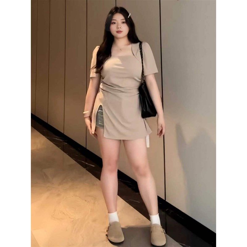 下半身失踪t恤大码女装夏季短袖御姐穿搭胖m法式小众开叉方领上衣