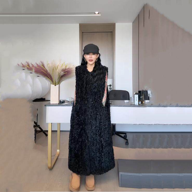 2025年秋冬新款彩色滩羊毛长毛羊羔绒环保皮草马甲女中长无袖外套