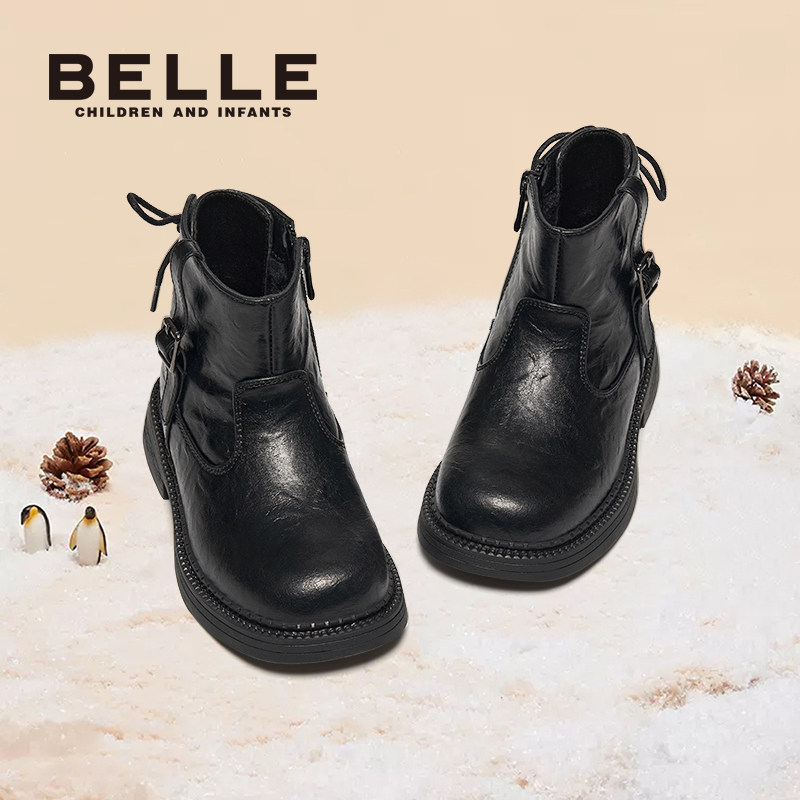百丽童鞋女童马丁靴秋冬新款男童加绒棉鞋短靴子儿童皮靴中大宝宝