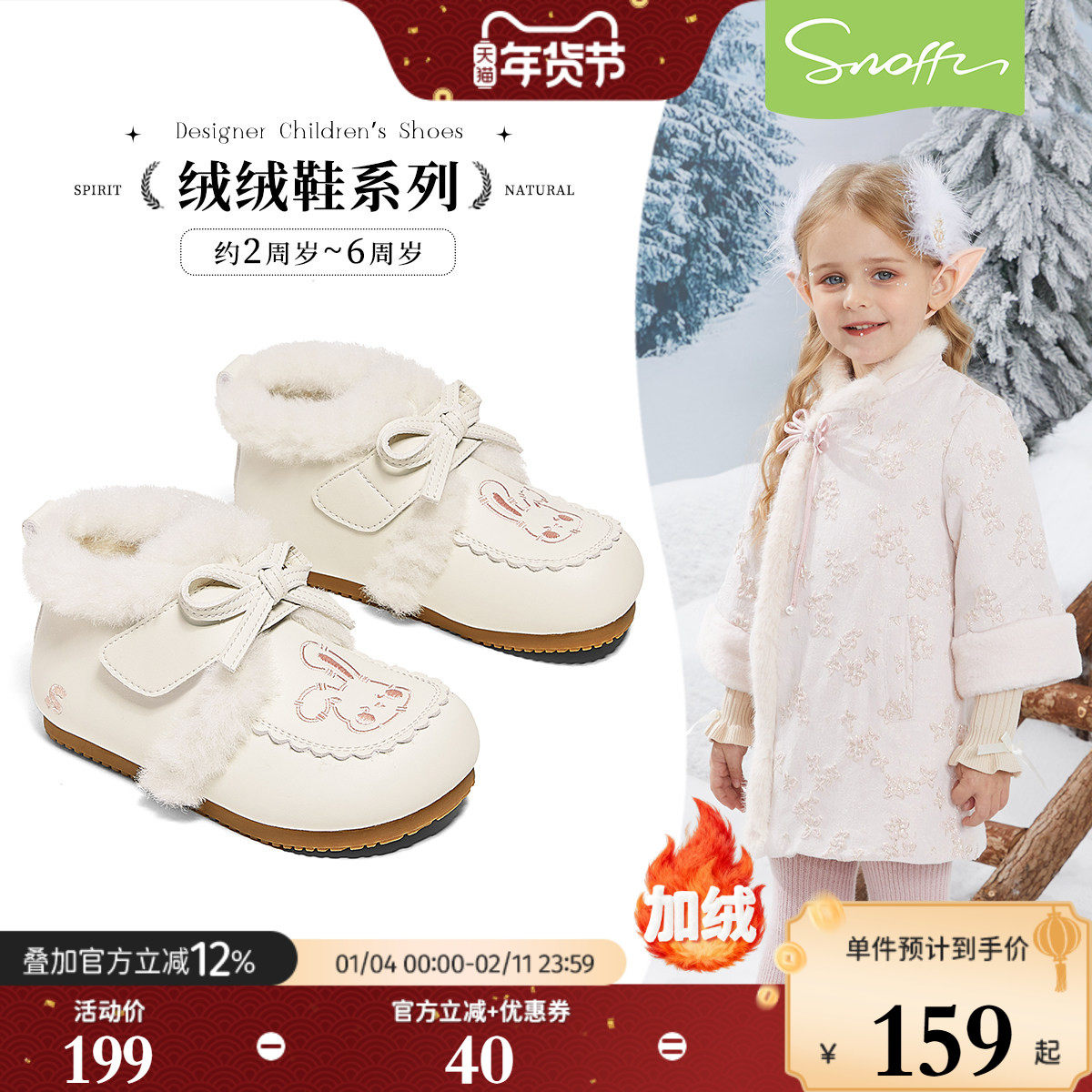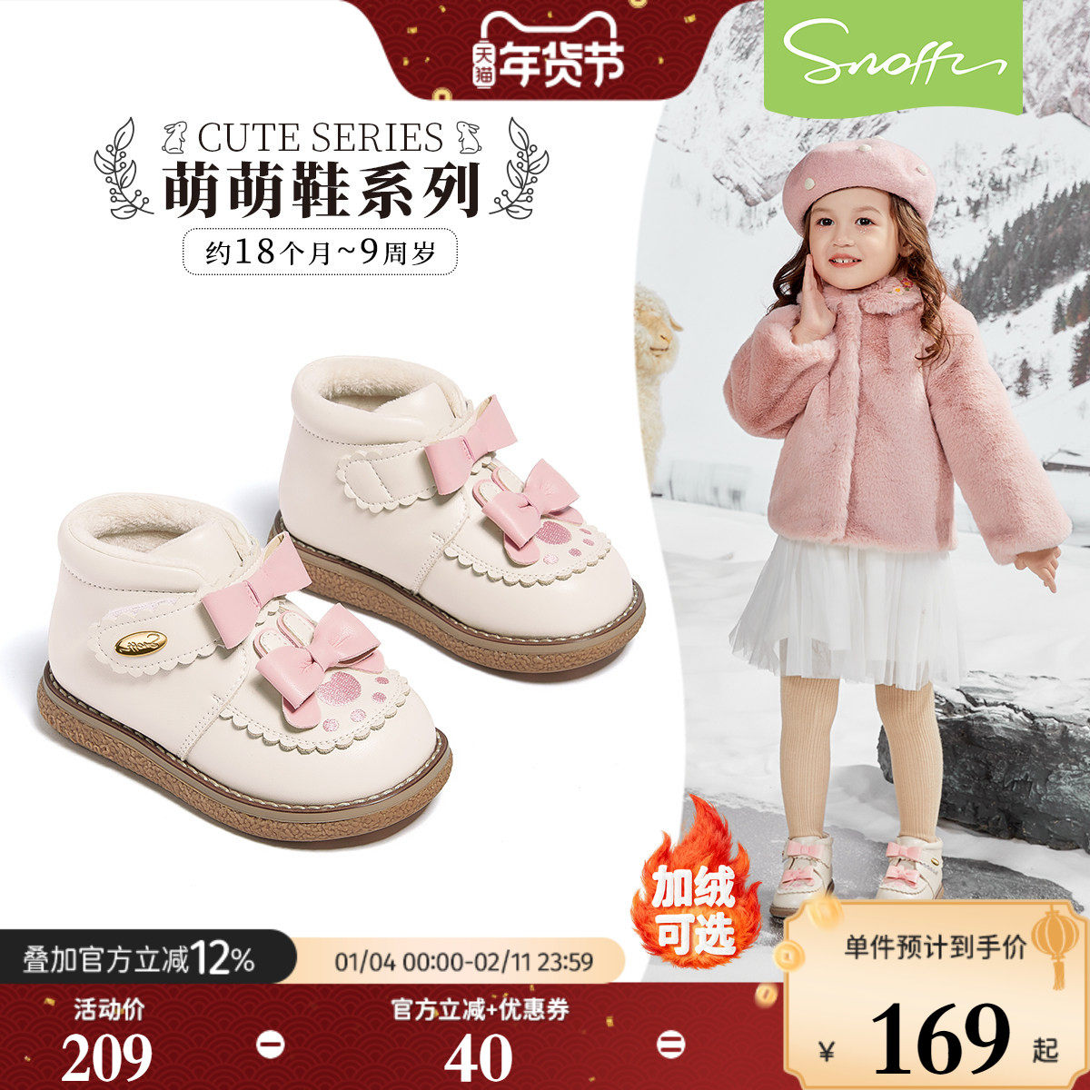 斯纳菲宝宝皮靴2026冬季新款儿童卡通兔子加绒保暖小公主女童棉鞋