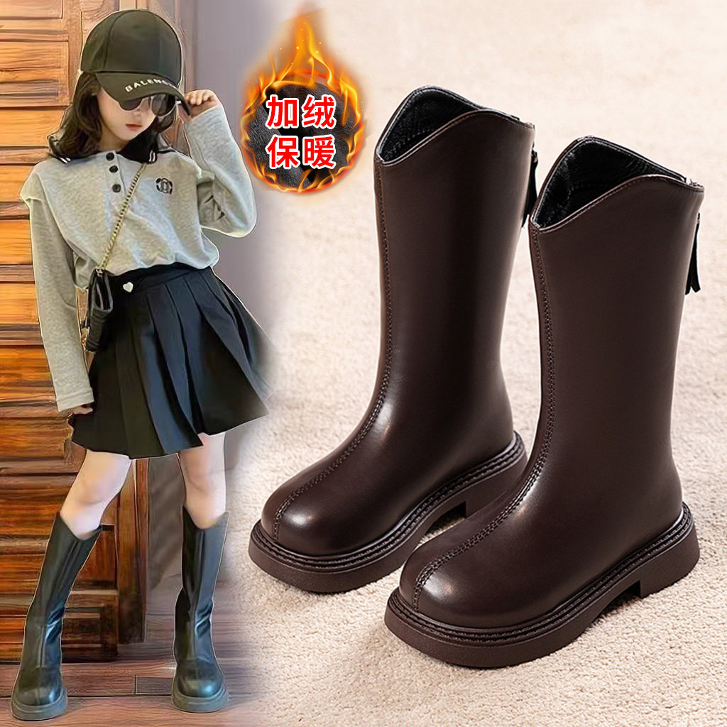 女童鞋子儿童长筒靴2025新款冬季小女孩百搭高筒靴加绒女宝宝皮靴