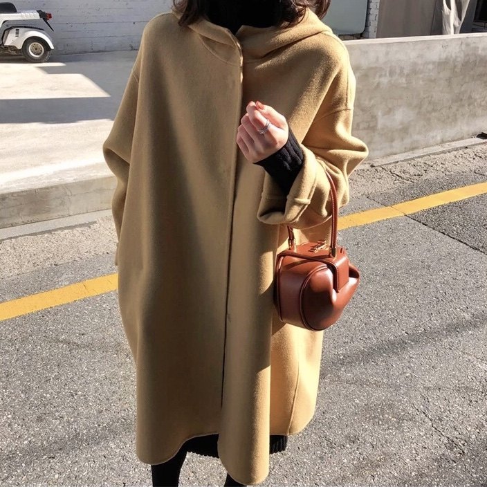 DRAN-701522连帽斗篷款宽松款双面冬季韩版羊毛大衣中长款加厚