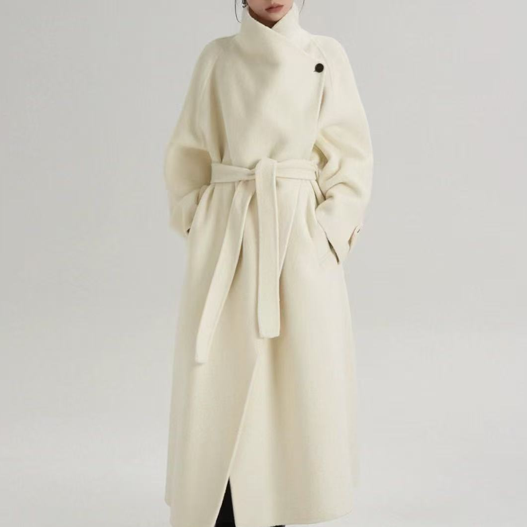 立领双面羊毛大衣女长款2025冬季新款韩版A版系带裙摆羊毛呢外套