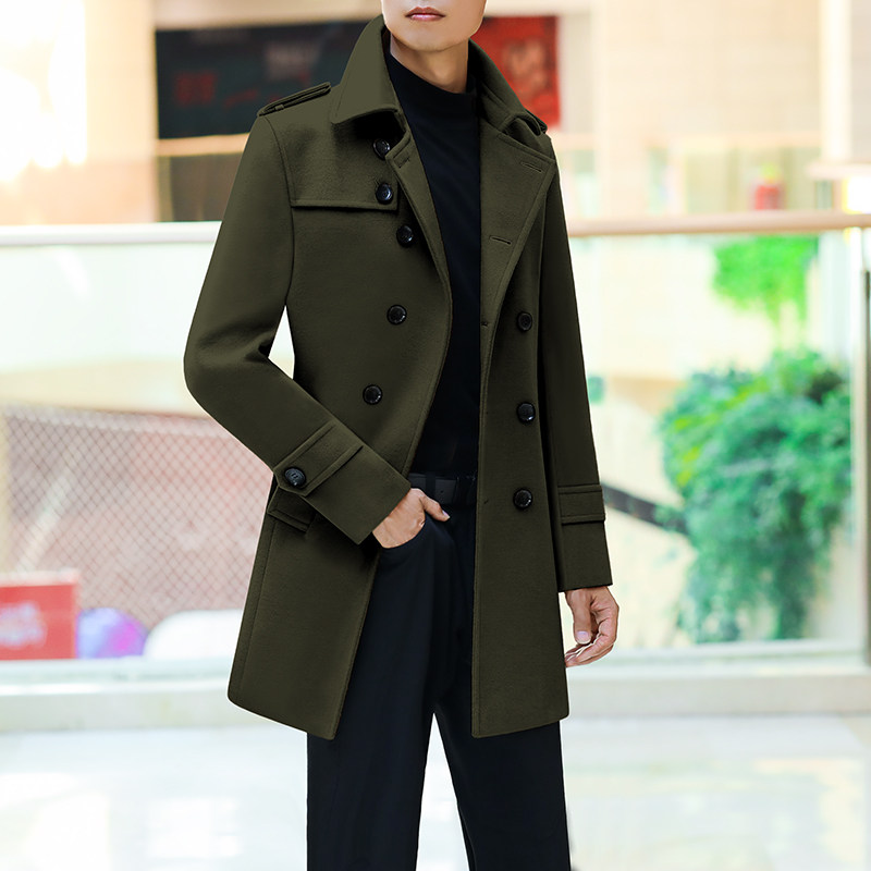 男秋冬英伦中休闲外套工装保暖厚风衣毛呢双排扣修身韩版羊毛大衣