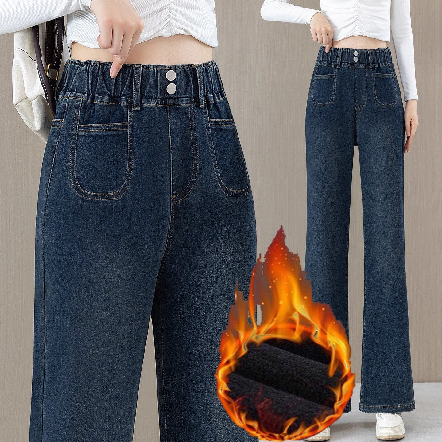 复古蓝微喇牛仔裤女冬季加绒加厚大码胖mm宽松显瘦梨型身材长裤子