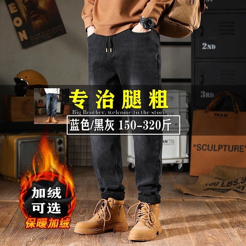 秋冬加绒弹力加肥加大码宽松牛仔裤男300斤粗腿松紧腰哈伦小脚裤