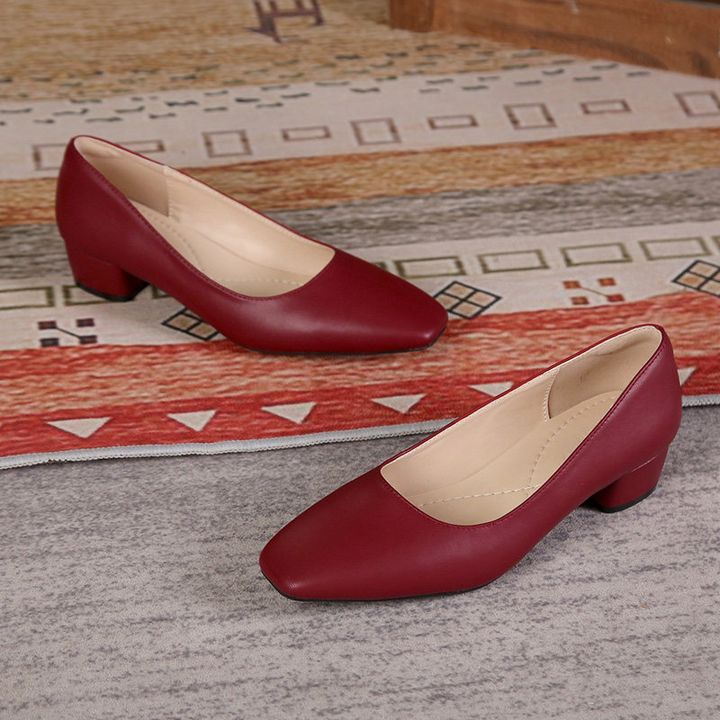 真皮粗跟方头酒红色软皮高跟时尚中跟妈妈鞋春秋款中年舒适单鞋女