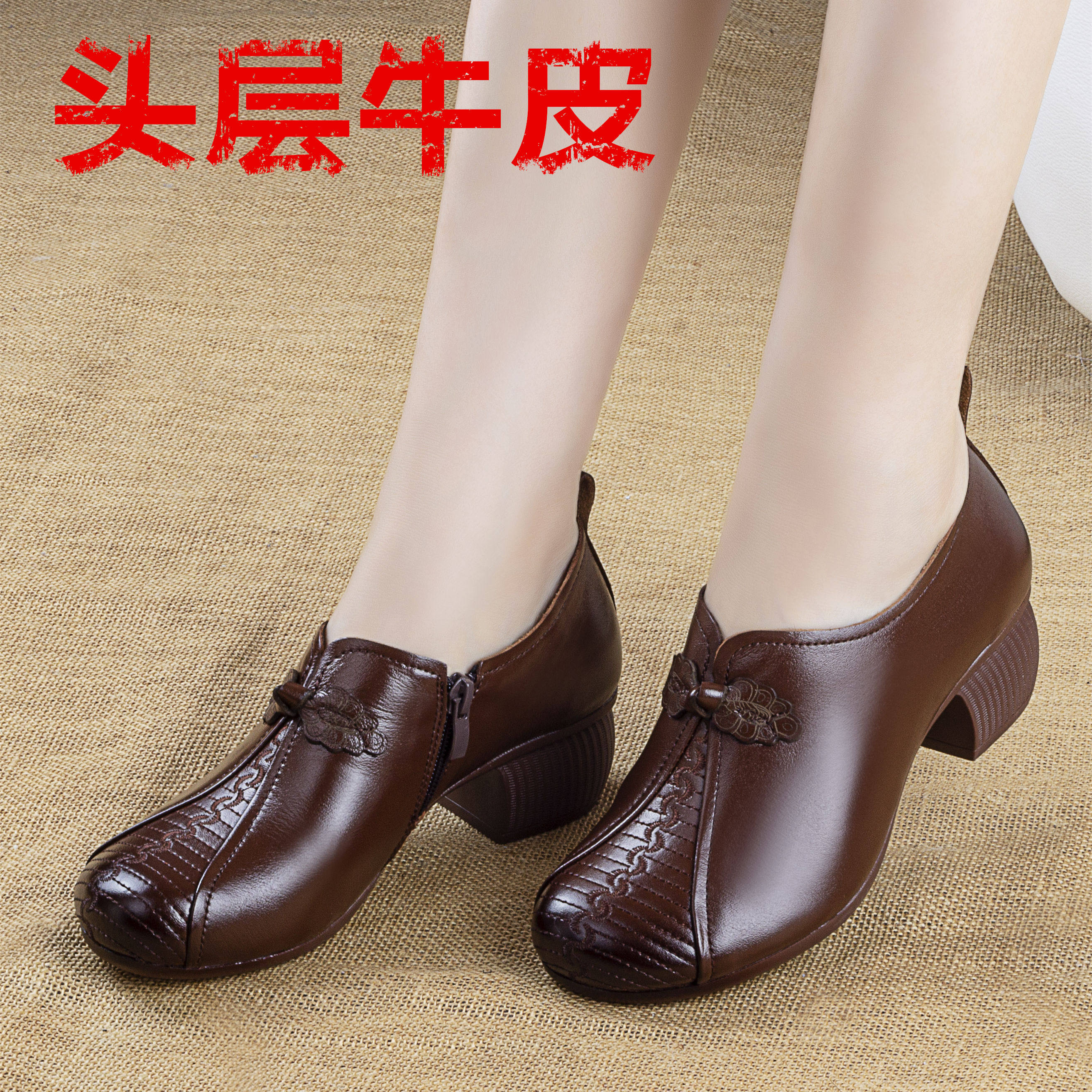 春秋新款民族风粗跟单鞋女中跟妈妈鞋真皮舒适浅口圆头中老年皮鞋