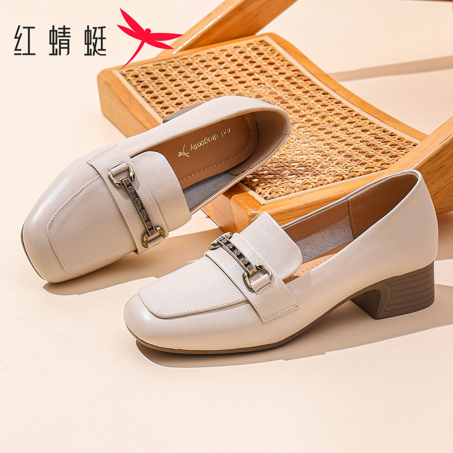 红蜻蜓女鞋2026春季一脚蹬乐福鞋方头粗跟单鞋通勤百搭中跟妈妈鞋