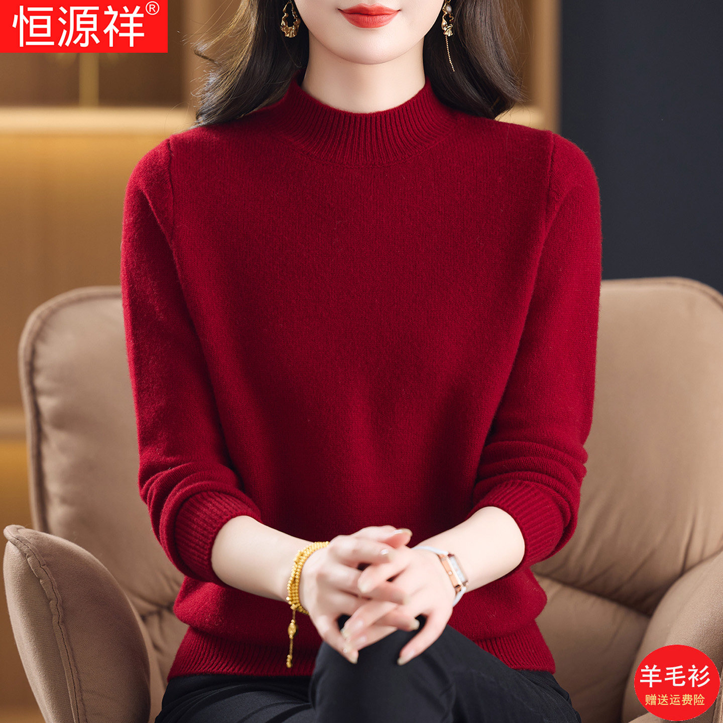 恒源祥酒红纯羊毛衫女半高领毛衣2025秋冬新款宽松大码内搭打底衫