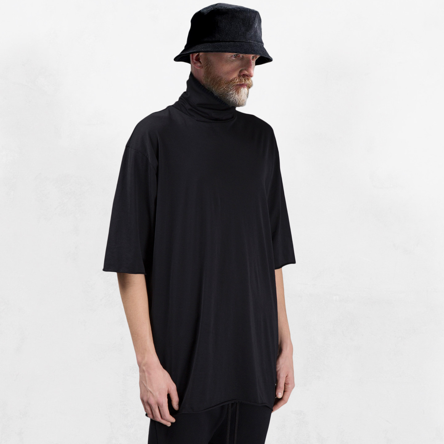GAOSTUDIOS黑色宽松高领T恤男简约落肩日系复古流浪诗人毛边短袖