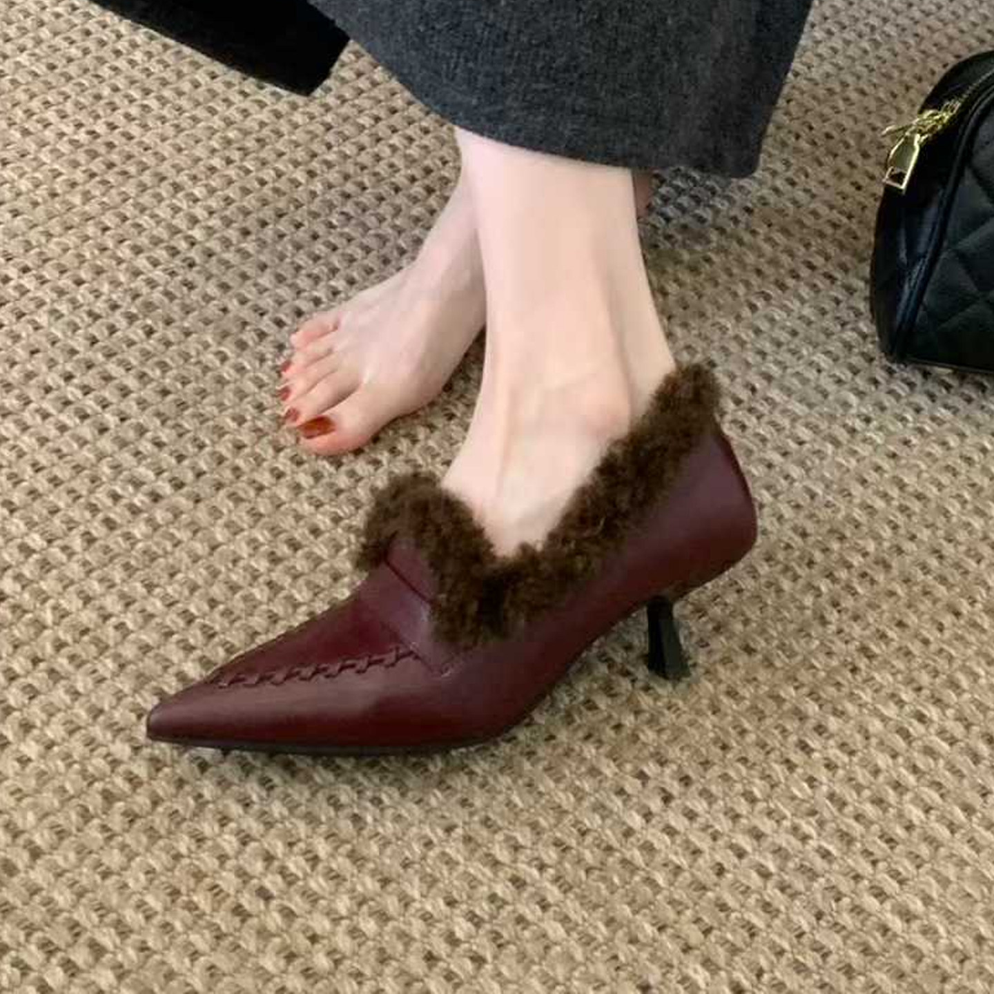 欧美时尚尖头细跟中高跟卷卷毛鞋口加绒保暖及裸靴秀气瘦脚单鞋女