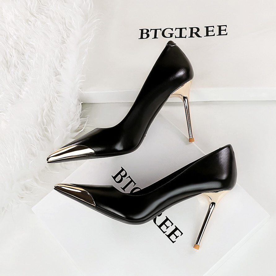 欧美风金属尖头高跟鞋女电镀细跟拼色浅口职业宴会小跟鞋百搭单鞋