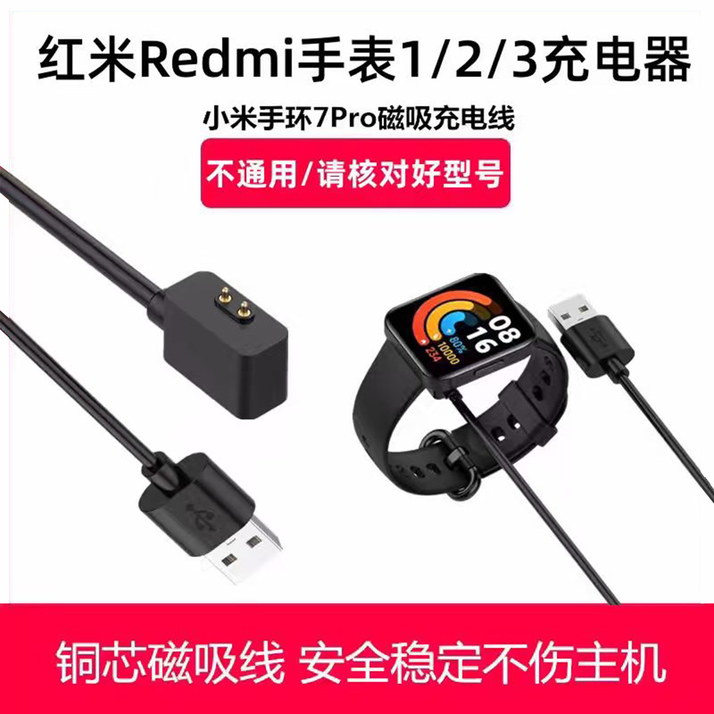 适用红米手表充电器Redmi1/2/3代智能手表腕带watch4/5快充底座小米手环7Pro/8/9pro磁吸线原装同款手环2线