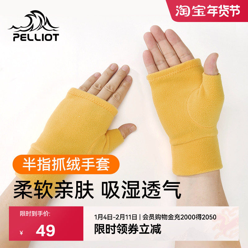 伯希和户外手套男女抓绒半指羊羔绒保暖骑行跑步徒步运动加厚加绒