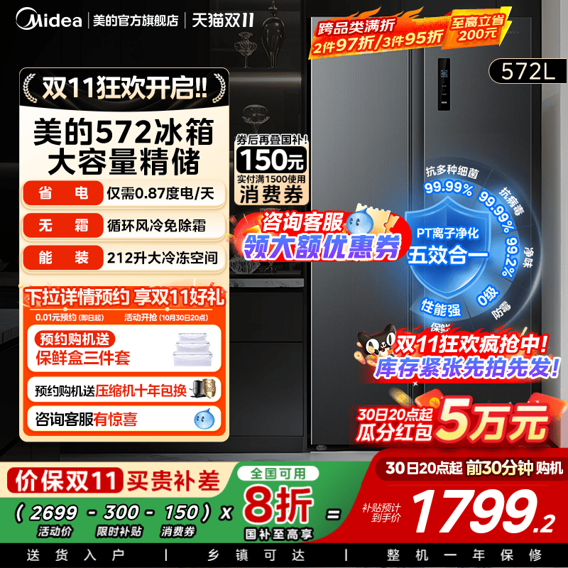 美的480升十字对开双开四门大容量一级风冷无霜嵌入式家用冰箱