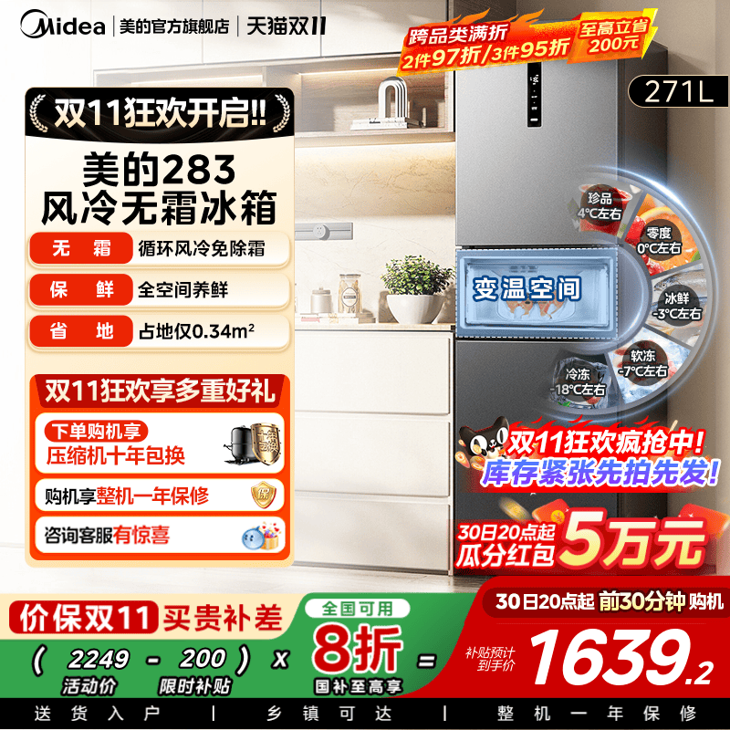 【政府换新补贴】美的249三门冰箱一级能效风冷无霜家用租房宿舍