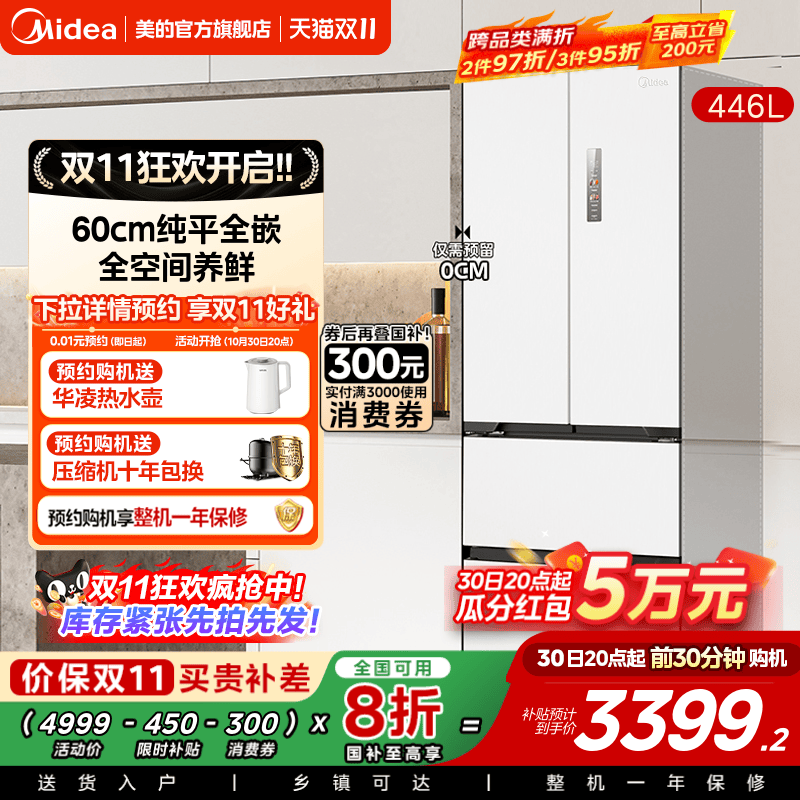 政府换新补贴美的超薄468零嵌入式法式多门双开家用冰箱一级白色