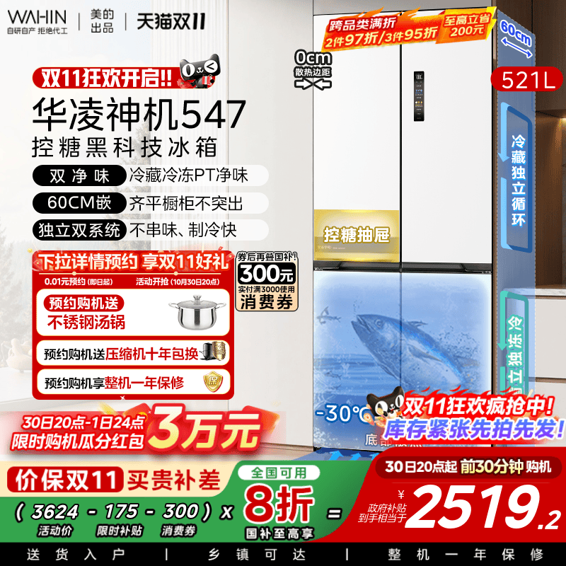 美的华凌神机547十字双开四门双系统超薄大容量零嵌家用冰箱一级